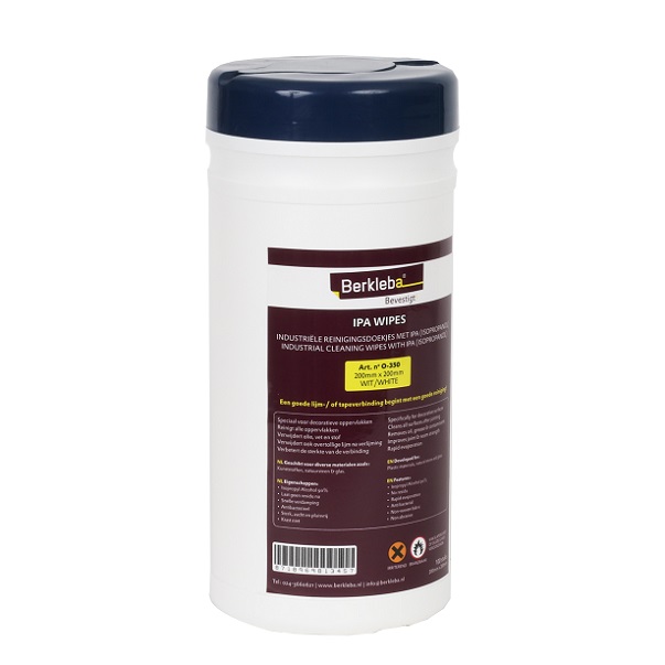 Dankzij deze industriële reinigingsdoekjes met IPA (isopropanol) maak je eenvoudig diverse materialen schoon voorafgaand aan het gebruik van tape of lijm. De verpakking functioneert als handige dispenser voor 100 sterke, zachte en pluisvrije doekjes. Geschikt voor reinigen van o.a. kunststoffen, natuursteen en glas. Verdampt snel en laat geen residu na.