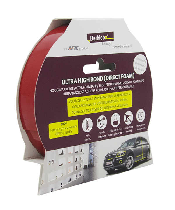Pure lijm in de vorm van dubbelzijdige AFTC tape. Voor sneller, mooier en efficiënter verbinden. Vervangt boren, popnagels of lassen. Voor het permanent verbinden van onder andere kunststoffen, glas, aluminium, etcetera. Zeer breed in zetbaar, van zeer gladde tot ruwe en onregelmatige oppervlakken. Bestand tegen UV, de meeste weekmakers en chemische stoffen.